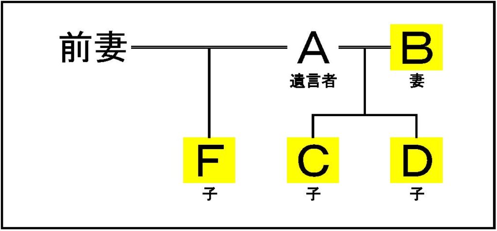 Aさんが亡くなると、相続人は前妻との間の子Fさん、妻Bさんと子Cさん・Dさんであり、遺言書がなければFさん、BさんとCさん・Dさんの全員で遺産分割協議をおこなう必要があります。