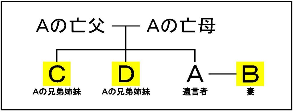 また、仮に、Aさんが亡くなったときにAさんの父母・曽父母・曽祖父母といった直系尊属が既に亡くなっていて、Aさんに兄弟姉妹がいれば、相続人は妻BさんとAさんの兄弟姉妹Cさん・Dさんであり、遺言書がなければBさんとCさん・Dさんの全員で遺産分割協議をおこなう必要があります。